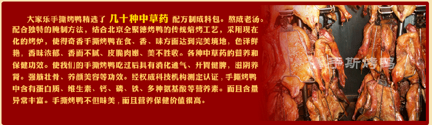 穿骨香手撕烤板鴨:久久鴨、鴨脖、鴨翅、鴨掌、鴨舌、鴨肝、鴨腸、翅尖、 鴨胗、鴨頭、鴨架、八道精美涼菜。(實際操作)